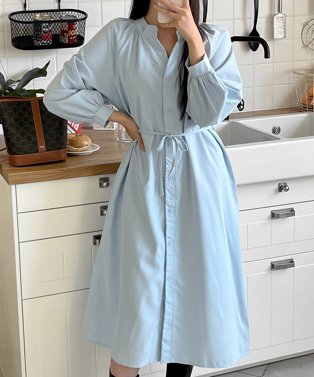 로페즈 허리 스트랩 헨리넥 롱 셔츠원피스 2color