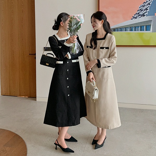 [하객룩추천💐][MADE] 드니쉬 스퀘어넥 배색 트위드 롱원피스(44~100) (가을하객룩-하객룩-가을코디-상견례룩-백화점퀄리티-출근룩-빅사이즈-체형커버-데이트룩)