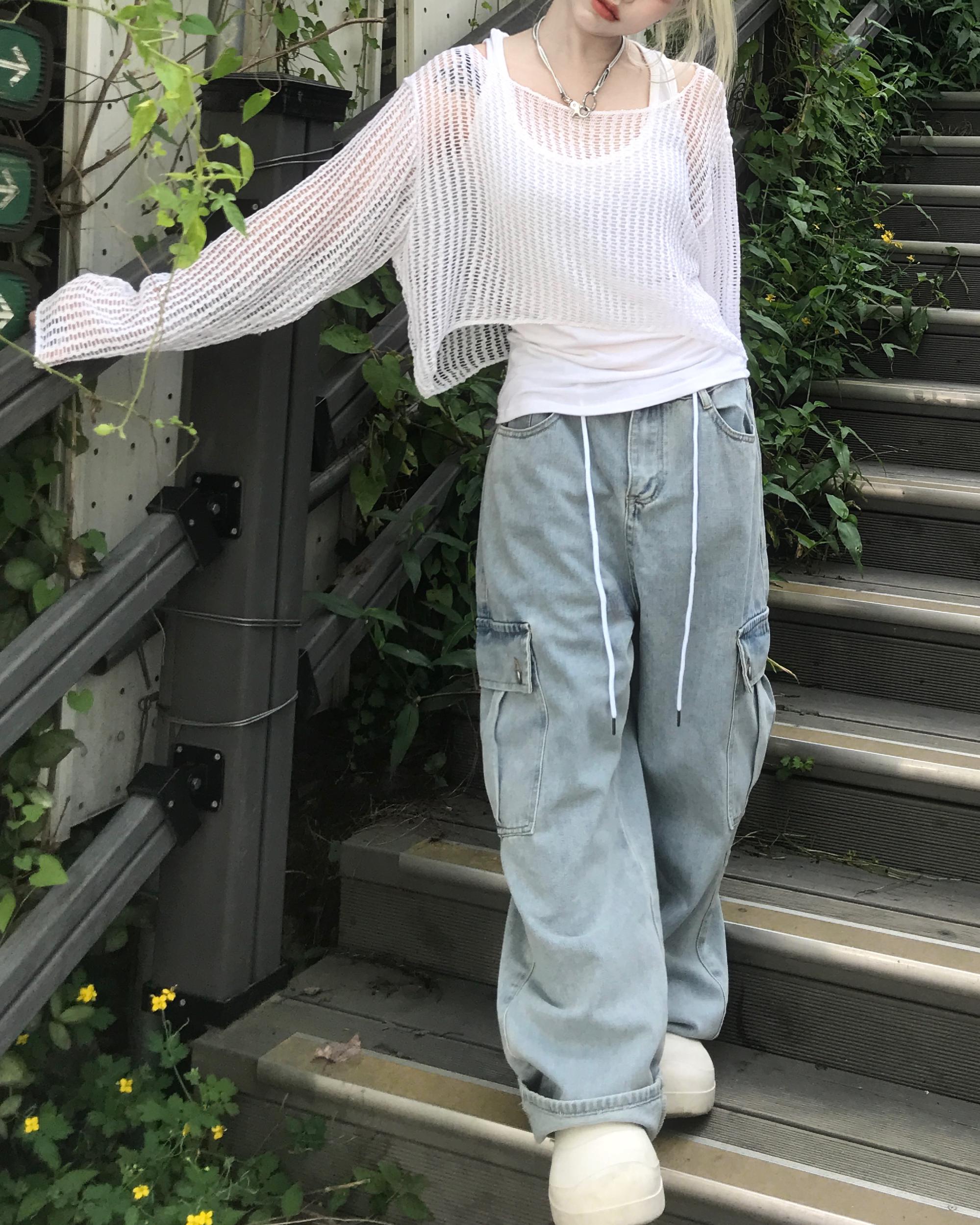 남녀공용 빈티지 스트링 카고 와이드 데님 팬츠