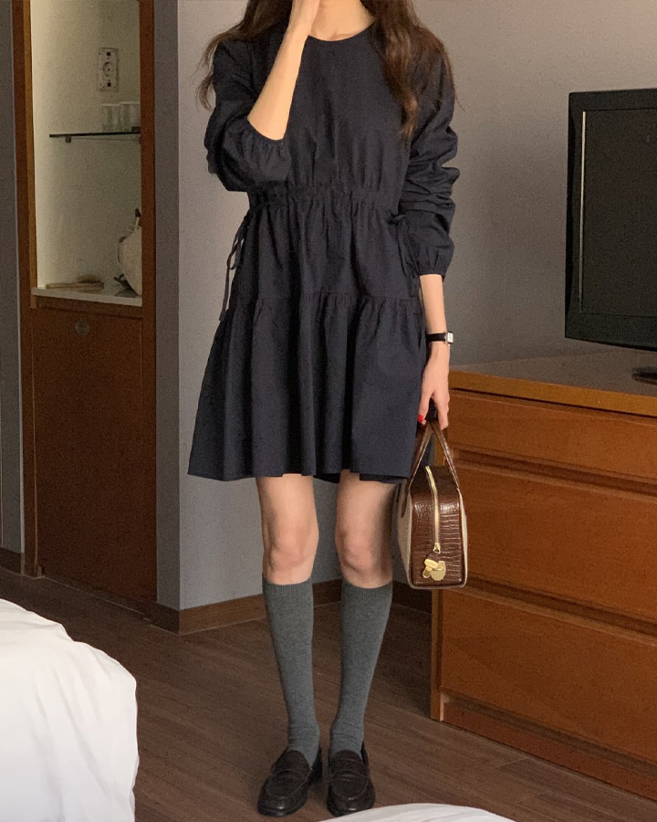 치즈 허리조절 에이라인 미니 원피스 캉캉 미디원피스 가을 면 긴팔 원피스(80472)