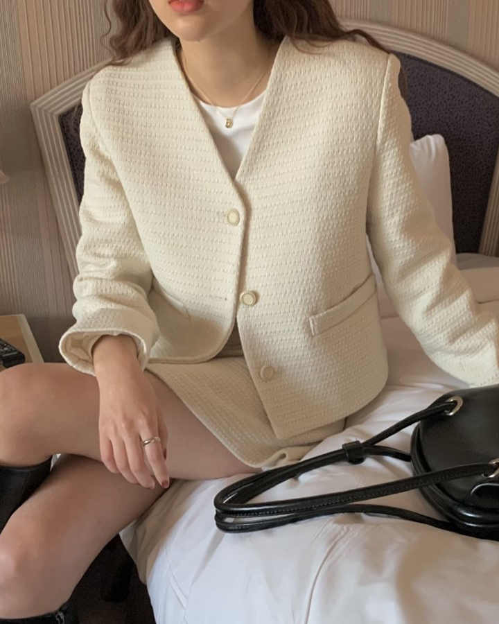가을 봄 깔끔 하객룩 노카라 오피스룩 여성 정장 트위드 브이넥 자켓(88212)