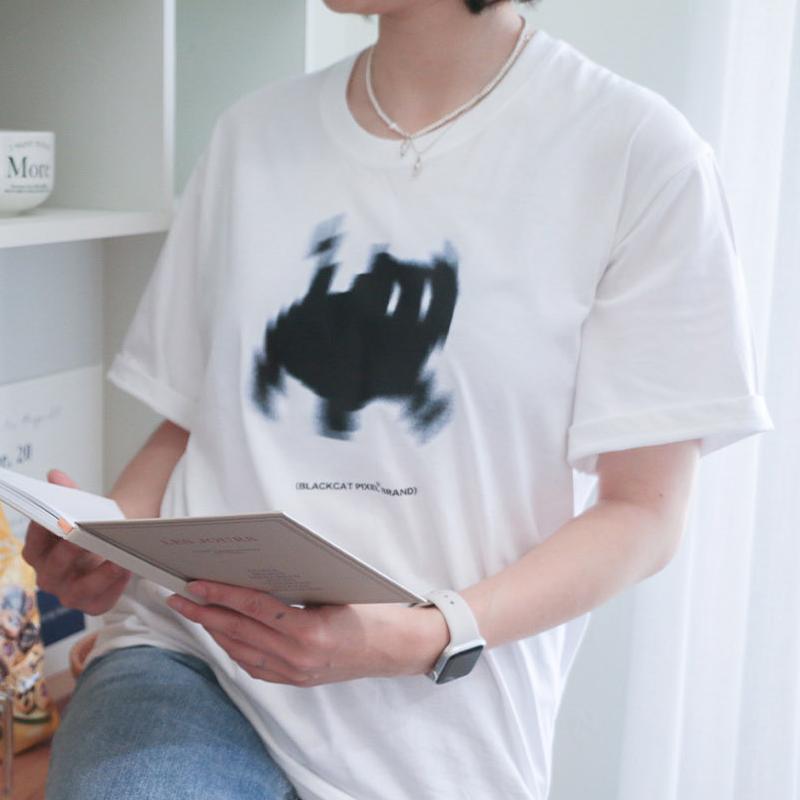 힙한 픽셀 고양이 우다다 반팔 티셔츠 2size [달리는 검은 블랙캣 그림 캐릭터 프린팅 귀여운 커플티]