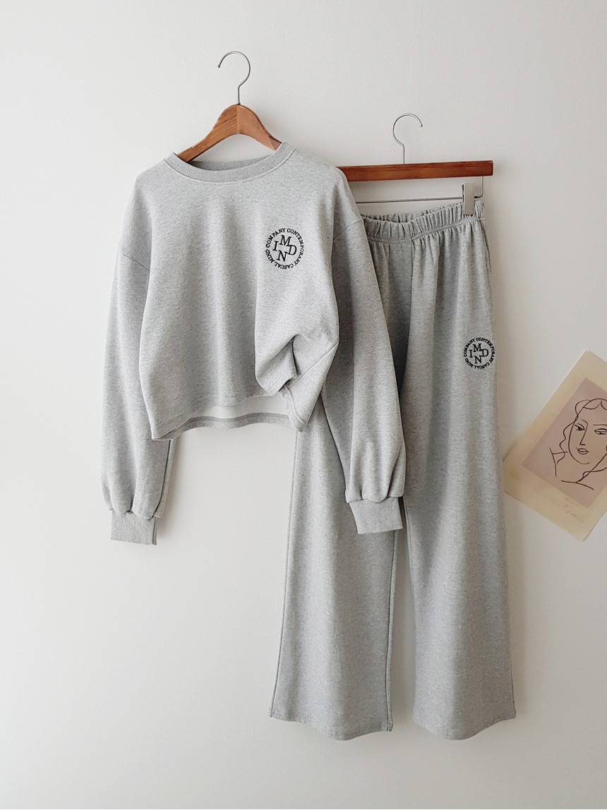 MIND SET/ 심플 자수 포인트 크롭 긴팔 티셔츠 밴딩 일자 와이드팬츠 트레이닝복 데일리 꾸안꾸 홈웨어 학생 체육복 운동복 추리닝 세트