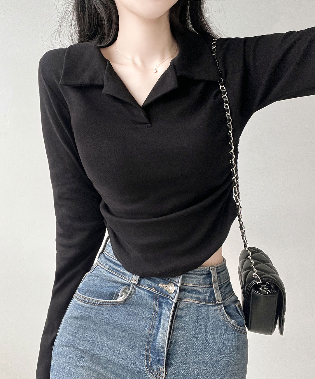 [허리잘록~/옆셔링] 모던 카라 옆셔링 크롭 긴팔 티셔츠