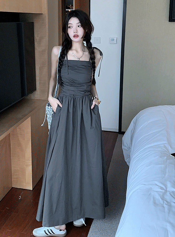 2color 뮤어 핀턱 끈나시 오프숄더 롱원피스