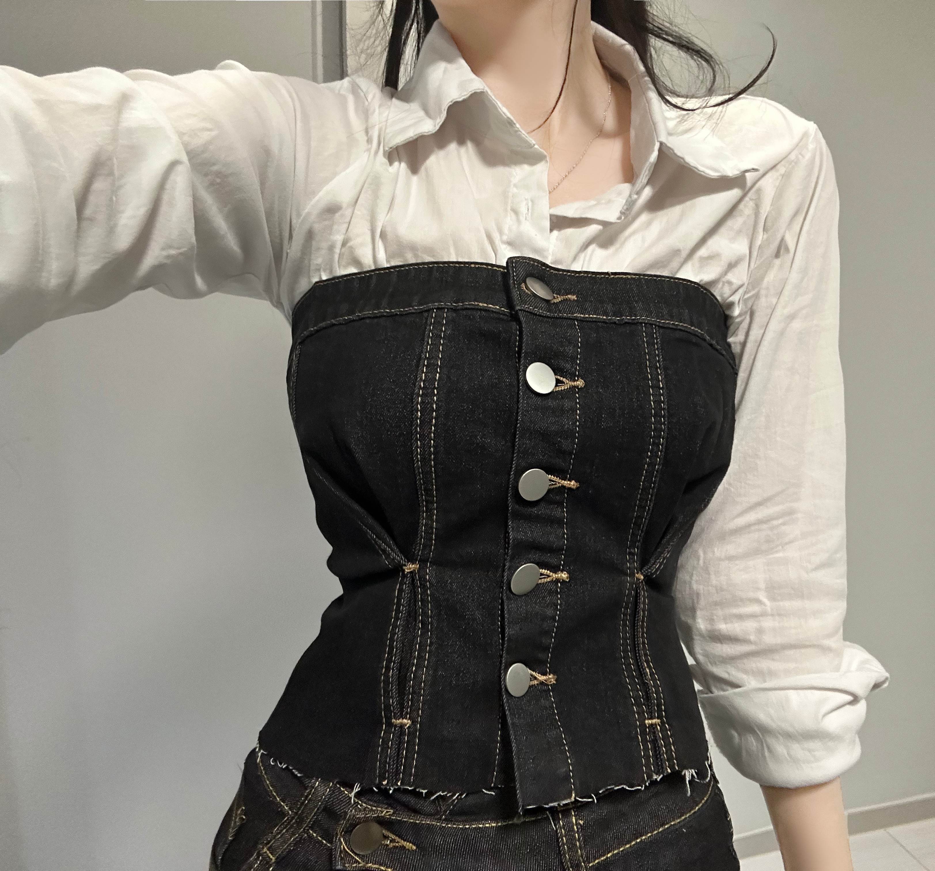 [핫걸✨세트추천]가을 간절기 데님 마죠 핀턱 크롭튜브탑 탑 청튜브탑 데님세트 데님탑 가을신상 가을옷