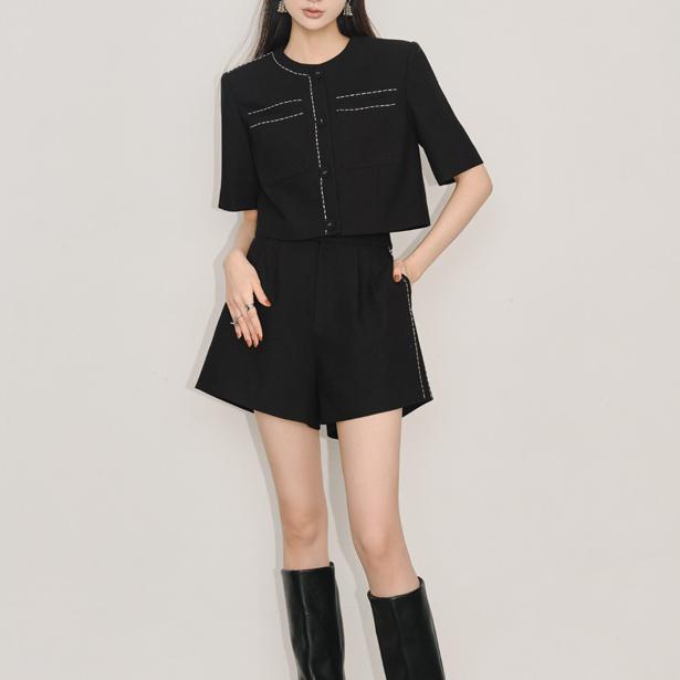 크롭셋업 블랙 반팔자켓 스티치 핀턱 버뮤다 반바지 투피스 여자수트 여성정장 세트
