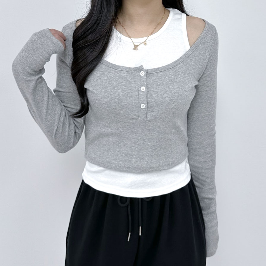 [긴팔 나시 레이어드 set] 크롭 y2k 레트로 단추 슬림핏 데일리 티셔츠 코디 세트