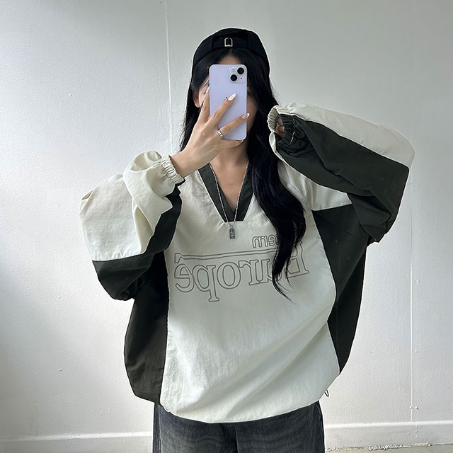 [블록코어/당일발송] 나일론 유럽 V넥 스트링 오버핏 맨투맨 - 3color