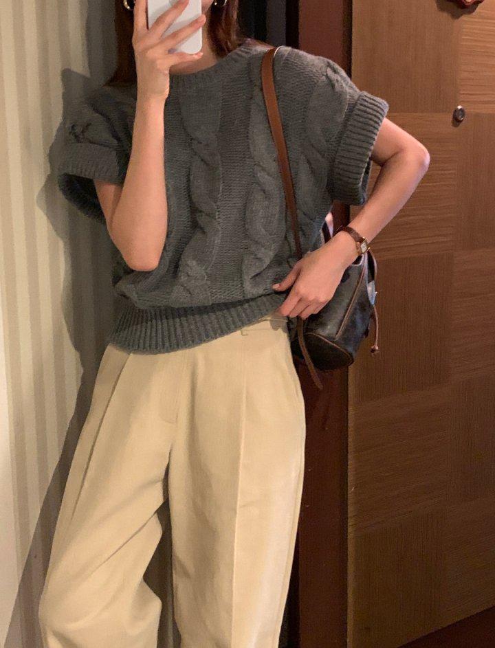 브레드 롤업 울50 꽈배기 반팔 니트 간절기 니트