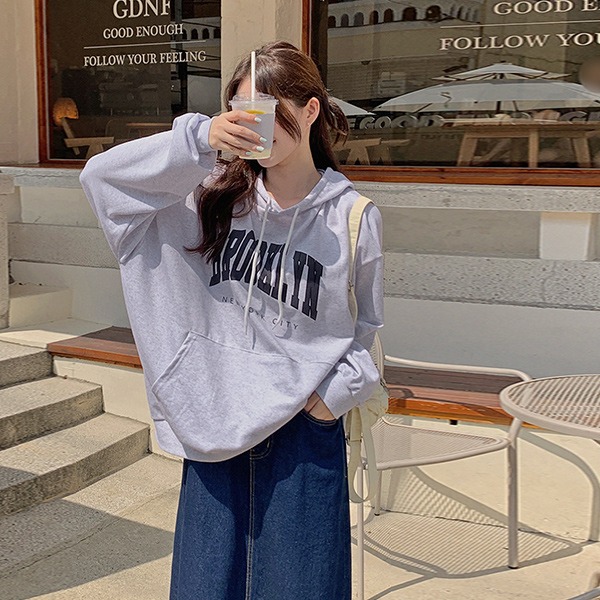 브루클린뉴욕 오버핏 프린팅 긴팔후드티(44~110) (프린팅후드-데일리룩-출근룩-빅사이즈-체형커버-오버핏-레터링후드-박시핏-면-커플룩-베이직-긴팔후드)