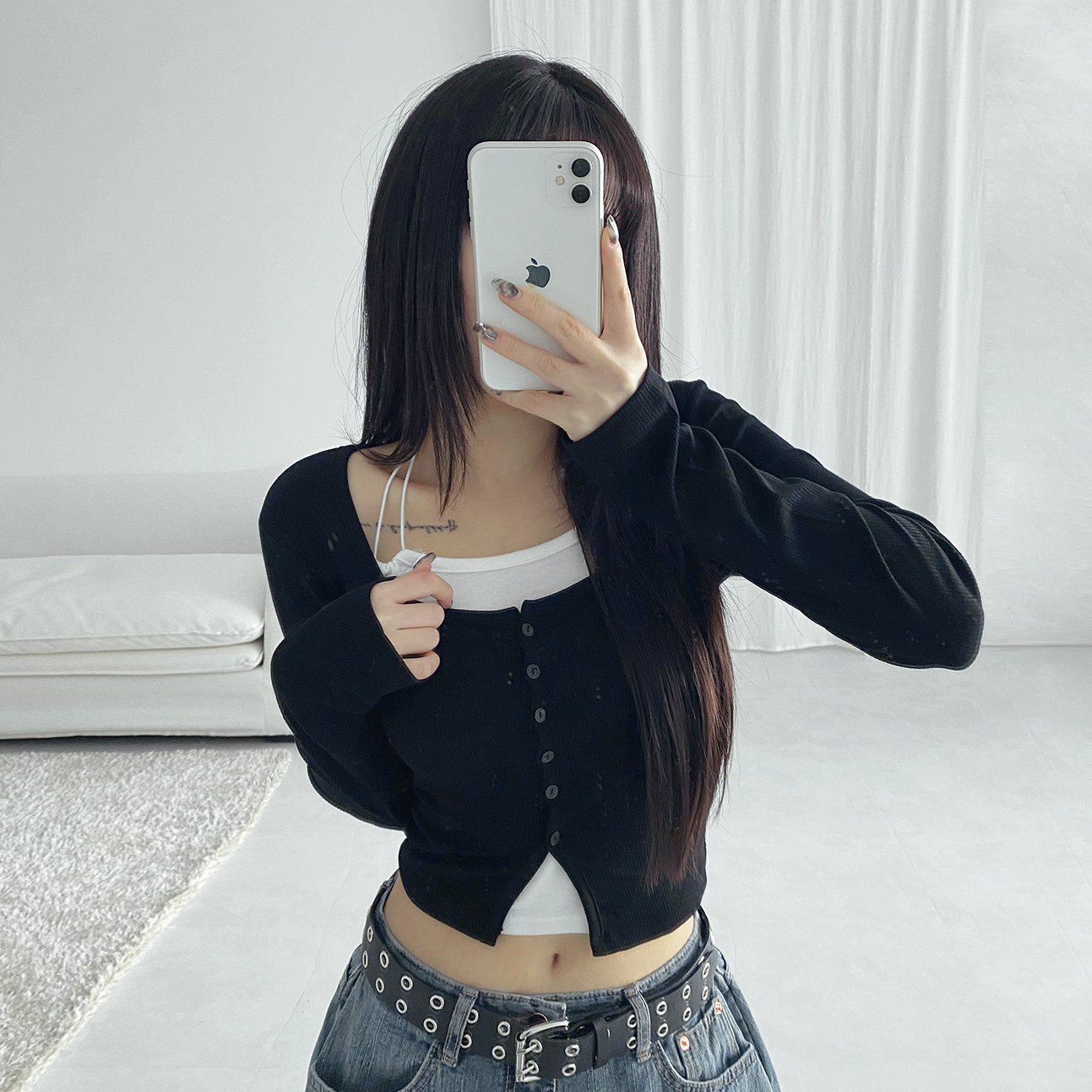 [누적판매6000장。+゚/레이어드/겨울이너/쫀쫀] 페이 스퀘어넥 버튼 트임 골지 크롭 티셔츠 가디건
