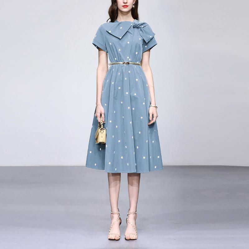 하늘색 리본 꽃자수 원피스 여름 결혼식 하객룩 상견례옷차림