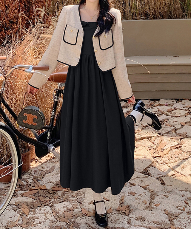 3사이즈 코코셋업 ( 빅사이즈 트위드자켓 봄신상 하객룩 결혼식 상견례 밴딩치마 투피스 끈나시원피스 밴딩 투피스 하객원피스 )