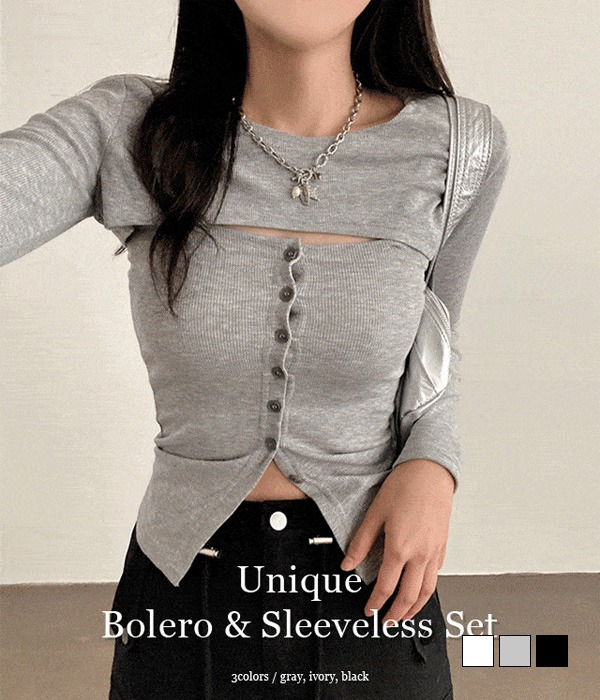 [무료배송] 유니크한 코디선택, 린더 긴팔 볼레로 티셔츠 트임 버튼 나시 투피스 레이어드 세트