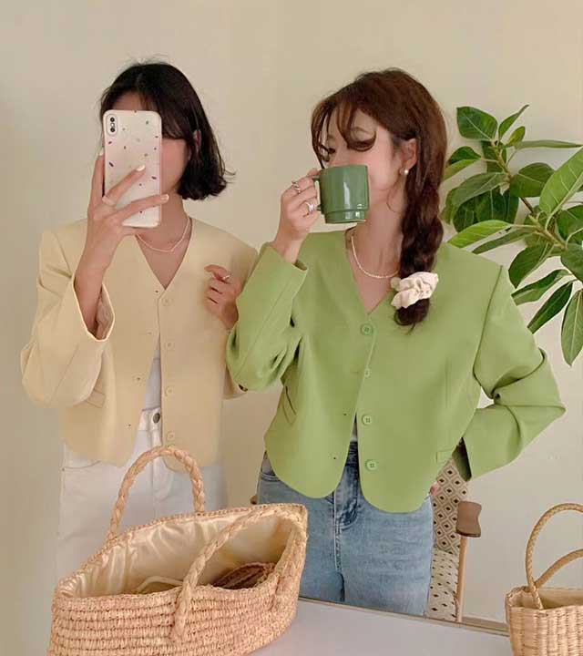 [하객룩] 브이넥 세미 크롭 블레이저 자켓