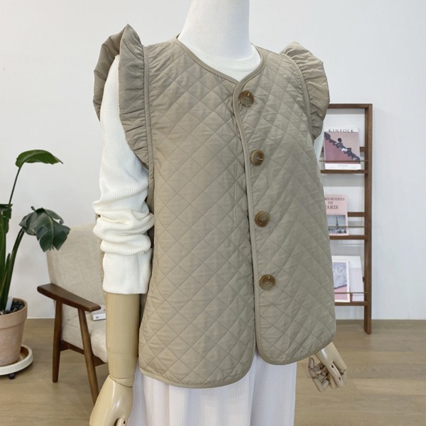 날개 조끼)퀄팅조끼/베스트/조끼패딩/날개소매셔링/패딩조끼/셔링소매/프릴소매/조끼자켓/다이아패턴무늬/누빔/점퍼/단추/베이지