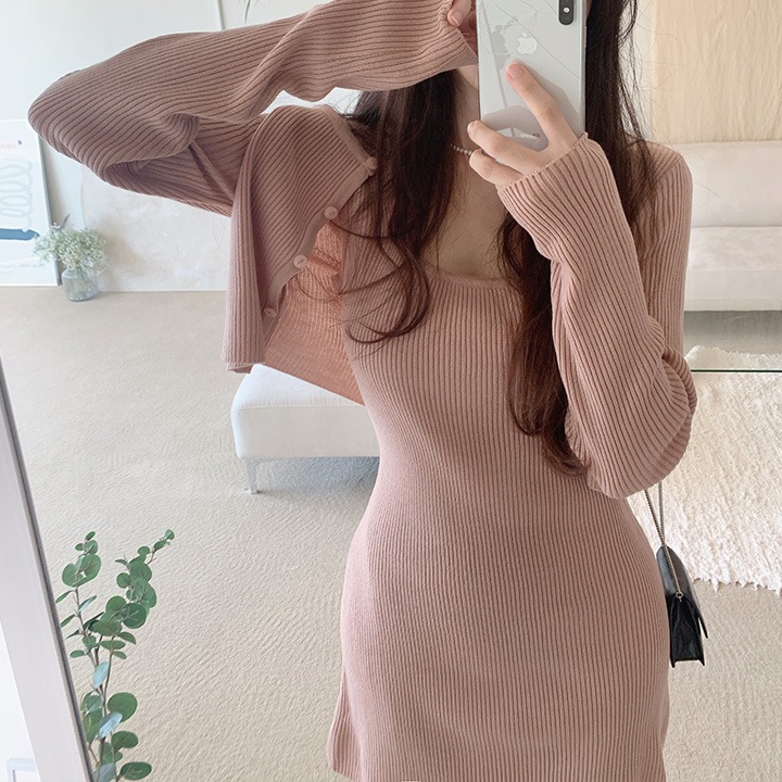 (SET) 몽델 크롭 가디건+스퀘어넥 A핏 원피스 울 골지 니트 투피스 (크림,핑크,블랙)