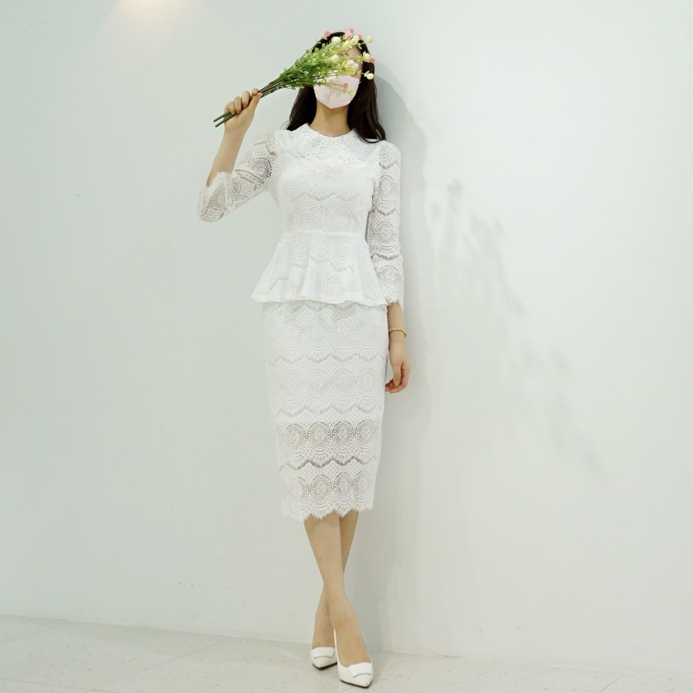 하객룩 기퓌르 레이스 카라 페플럼 H라인 정장 원피스