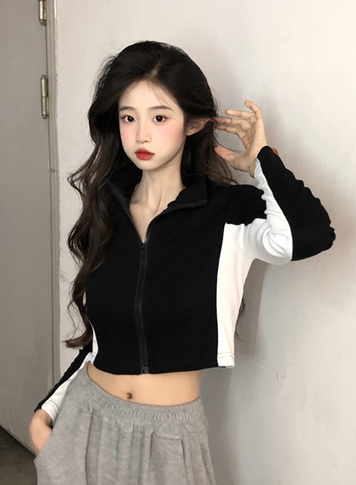 여성스러운 허리 얇아보이는 배색하인 페이트 운동 재킷 크롭기장 트레이닝 편안한 의상 가을 캐주얼 스포티한 힙한