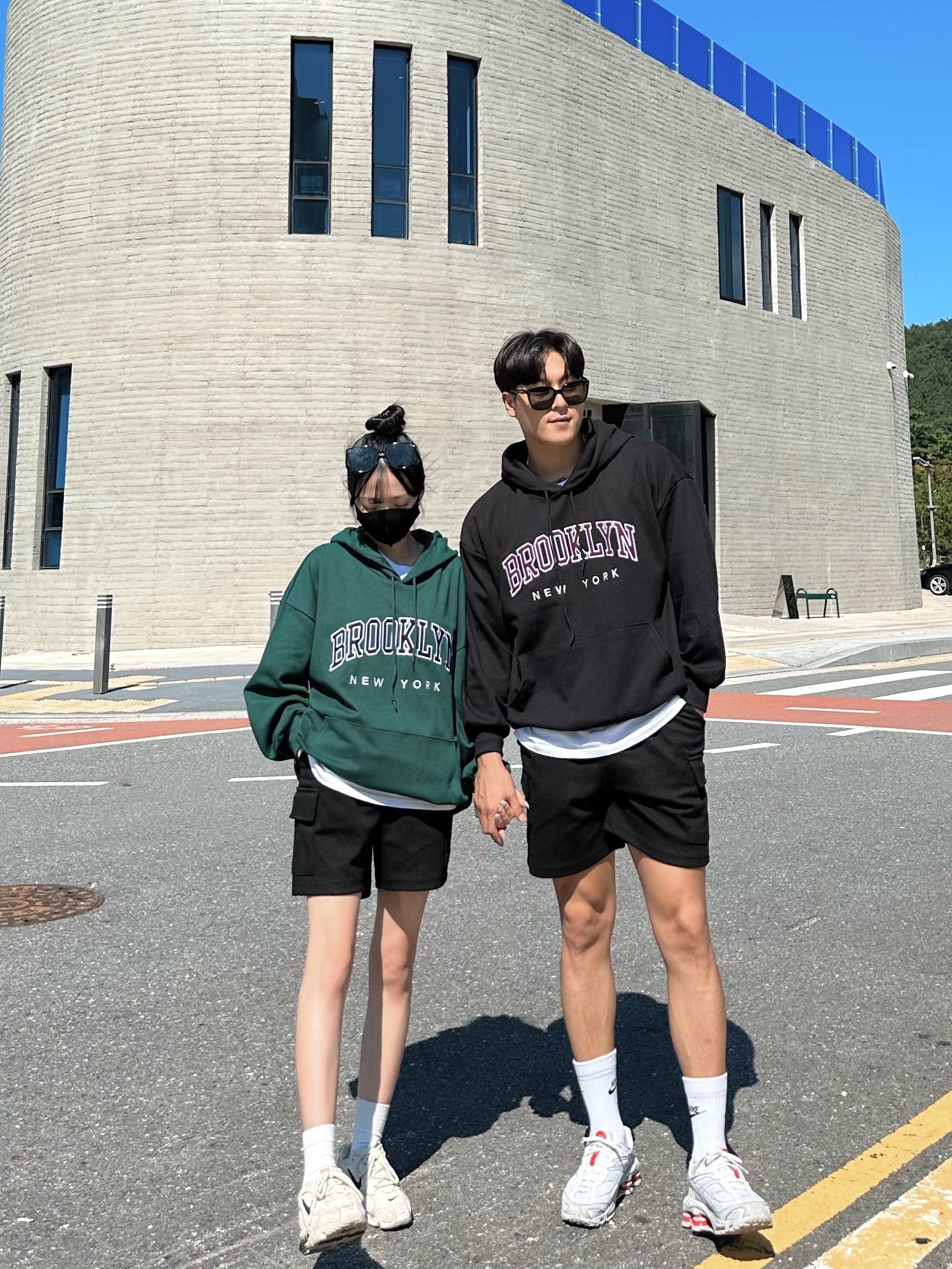 세트가능/브루클린 후드티 카고 반바지 커플룩 스윗 트레이닝 세트 투피스 커플 시밀러룩 레터링 남녀공용 꾸안꾸 오버핏 봄 가을 겨울 빅사이즈 스트릿데일리 레터링 유니크 그린