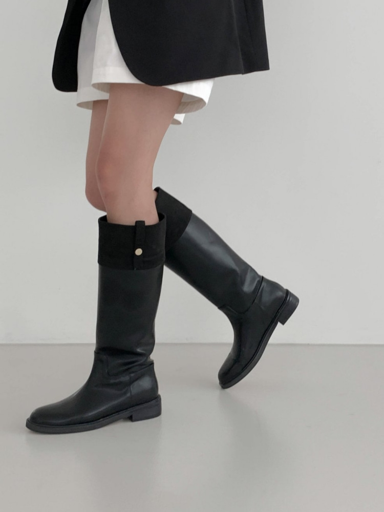 메이스 가죽 스웨이드 콤비 금장 골드 로고 장식 롱 부츠 3cm