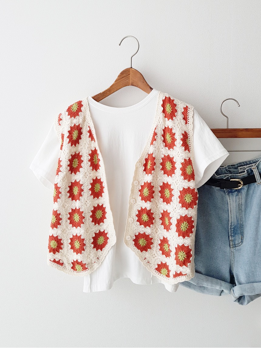 귀여워! 레트로무드 보헤미안 데이지 플라워 패턴 짜임 단추 오픈 니트 조끼 베스트