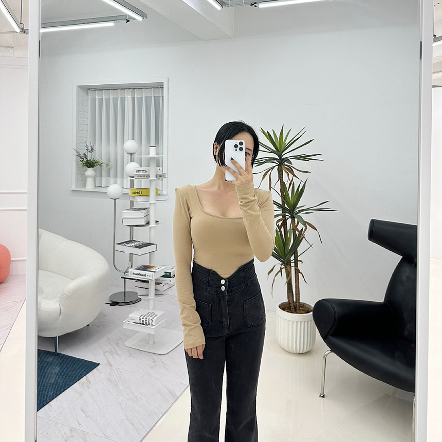 가슴 어깨 패드 쫀쫀 슬림 말랑 크롭 무지 컬러 긴팔 티