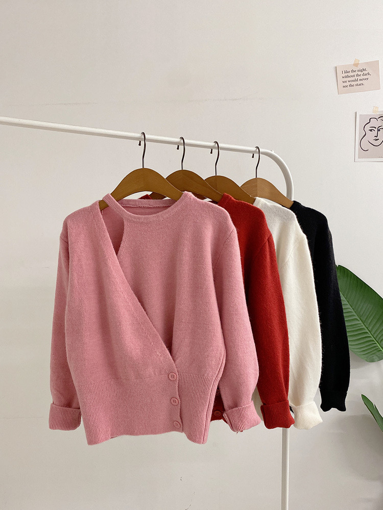 휴키 숄더트임 버튼 랩 긴팔 니트(4color)
