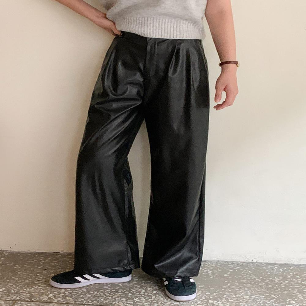 여자 포인트 블랙 레더 가죽 롱 와이드 팬츠