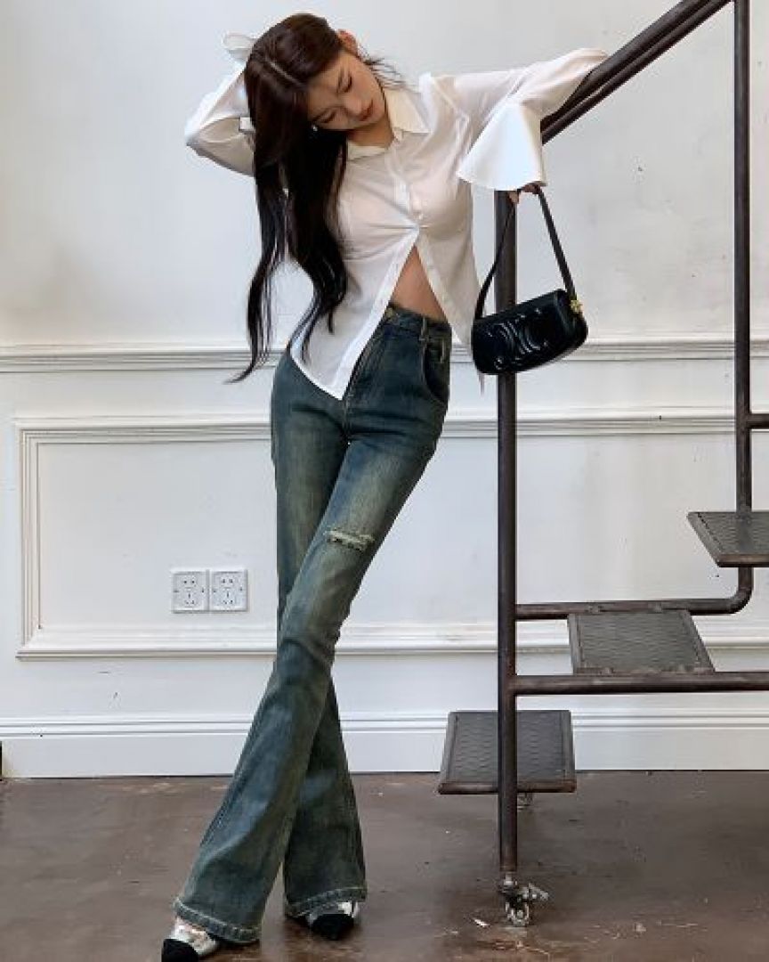 여성 하이웨스트 나팔 청바지 헤짐 찢청 워싱 빈티지 슬림핏 부츠컷 스판 가을 청바지