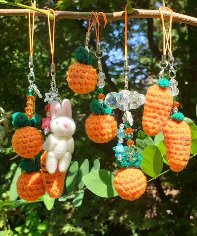 뜨개 귤 감귤 당근 폰줄 키링 군번줄 책갈피 핸드폰 부착 고리 열쇠고리 오렌지 주황 키홀더 북마크 뜨개질 인형 제주도 토끼 구름 별 하늘 비즈 그린 네잎클로버 행운 소원 선물