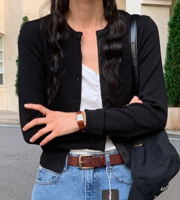 검정 라운드 여성 가디건 얇은 면 회색 니트 가디건 사무실 숏 크롭 가디건