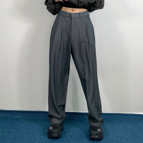 [25~32/UNISEX/*ootd] 스트라이프 핀턱 와이드핏 슬랙스 통넓은 하체커버 통넓은 커플 남여공용 정장바지 롱팬츠 [2156]