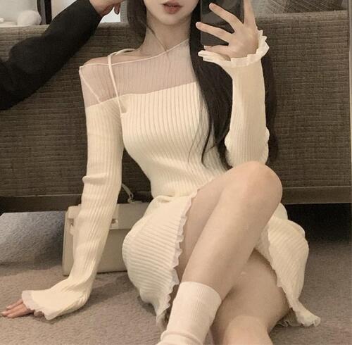[퀄리티보장/2color] 빈스 오프숄더 어깨 리본 끈 언발 시스루 프릴 슬림 골지 니트 원피스