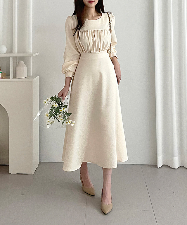 얼리티 봄 가을 하객룩 라운드넥 퍼프 리본 셔링 플레어 롱 원피스