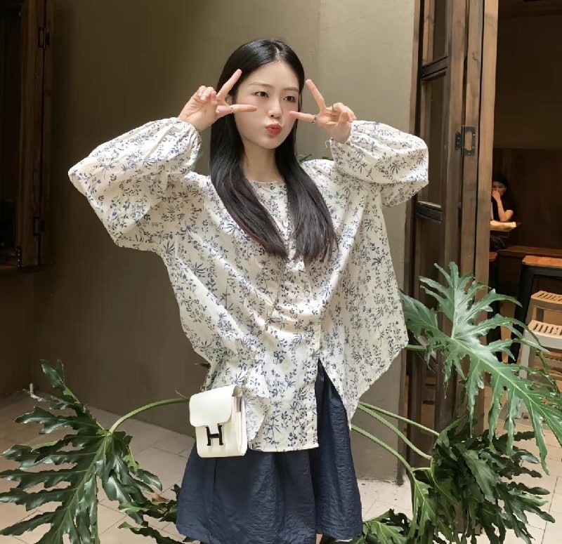 가을 라운드넥 플라워 루즈핏 롱블라우스 긴팔 복고 빈티지 캐주얼 베이직 청순 오피스룩 학생룩 캠퍼스룩 여친룩 데이트룩 Y2K 일상룩 힙한 데일리룩