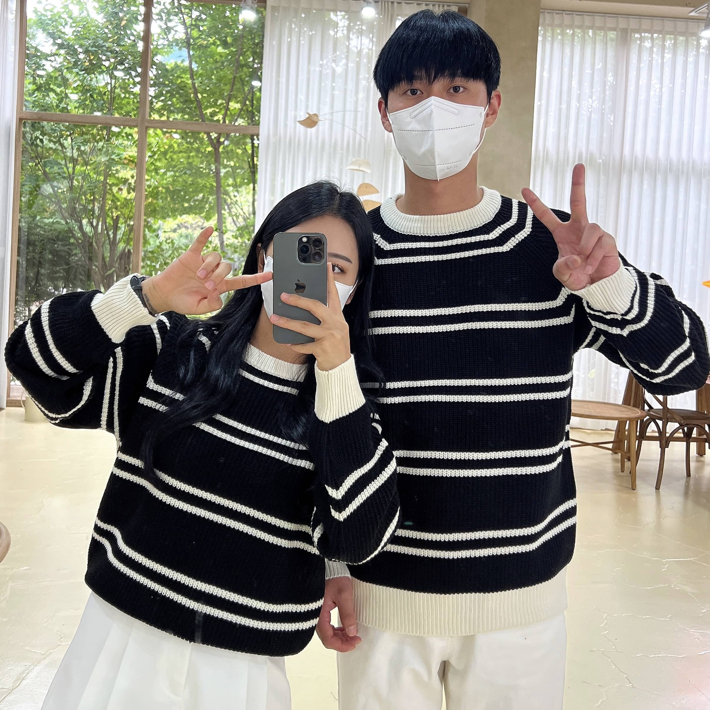 [커플시밀러룩]단가라 스트라이프 긴팔 오버핏/크롭 남녀공용 봄 가을 겨울 니트 데이트 연말 키작녀 빅사이즈 신혼여행룩