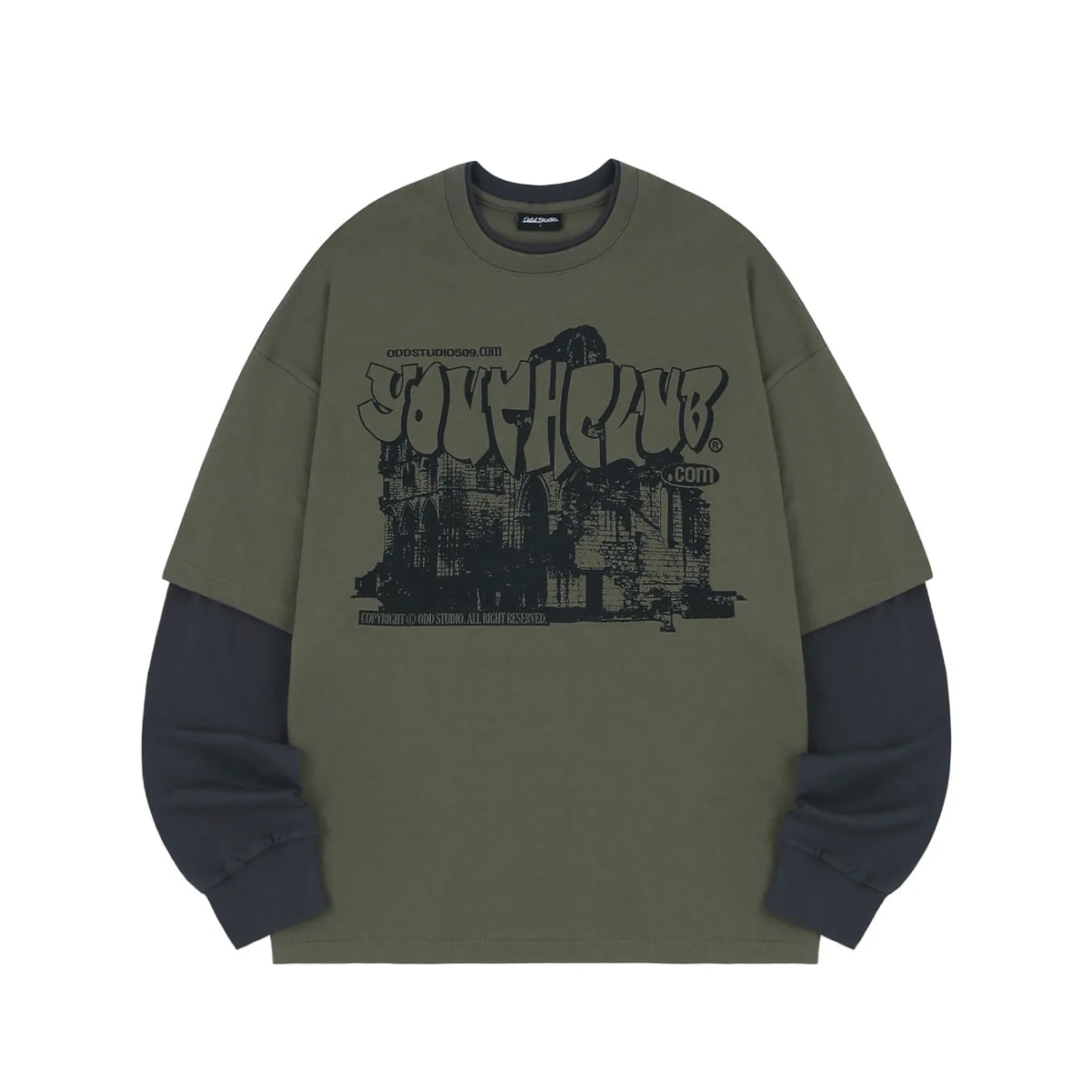 유스클럽 그래픽 레이어드 오버핏 롱 슬리브 - KHAKI