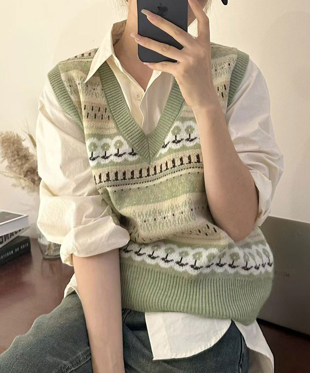 빈티지 자카르 패턴 니트 조끼 민소매 브이넥 조끼 봄 가을 데일리룩 데이트룩 여성 상의