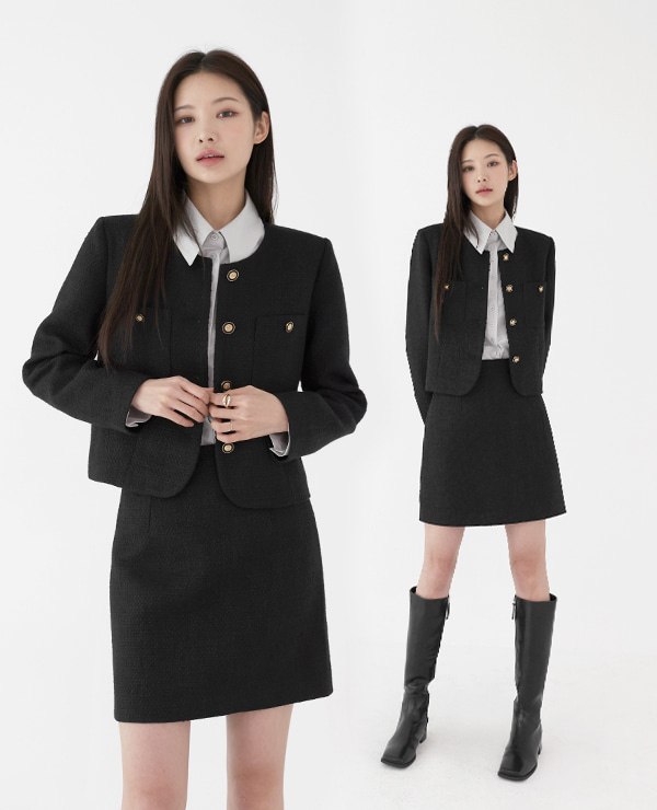 [겨울버전추가/자체제작/7천장판매] 리엘 트위드 노카라자켓 스커트 셋업 (1color)