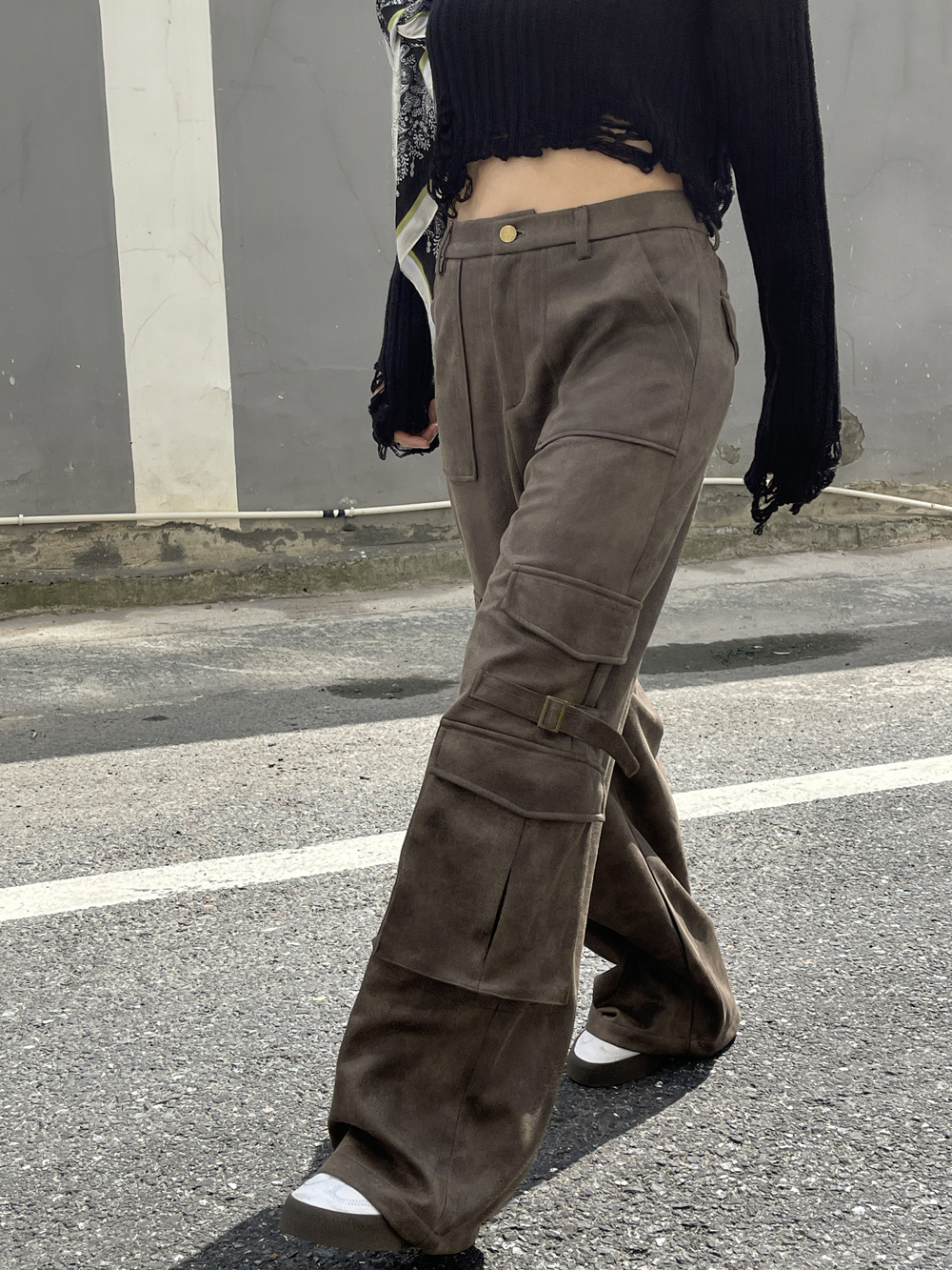 스웨이드 워싱 카고바지 PU 밴딩 겨울 와이드팬츠 트레이닝바지