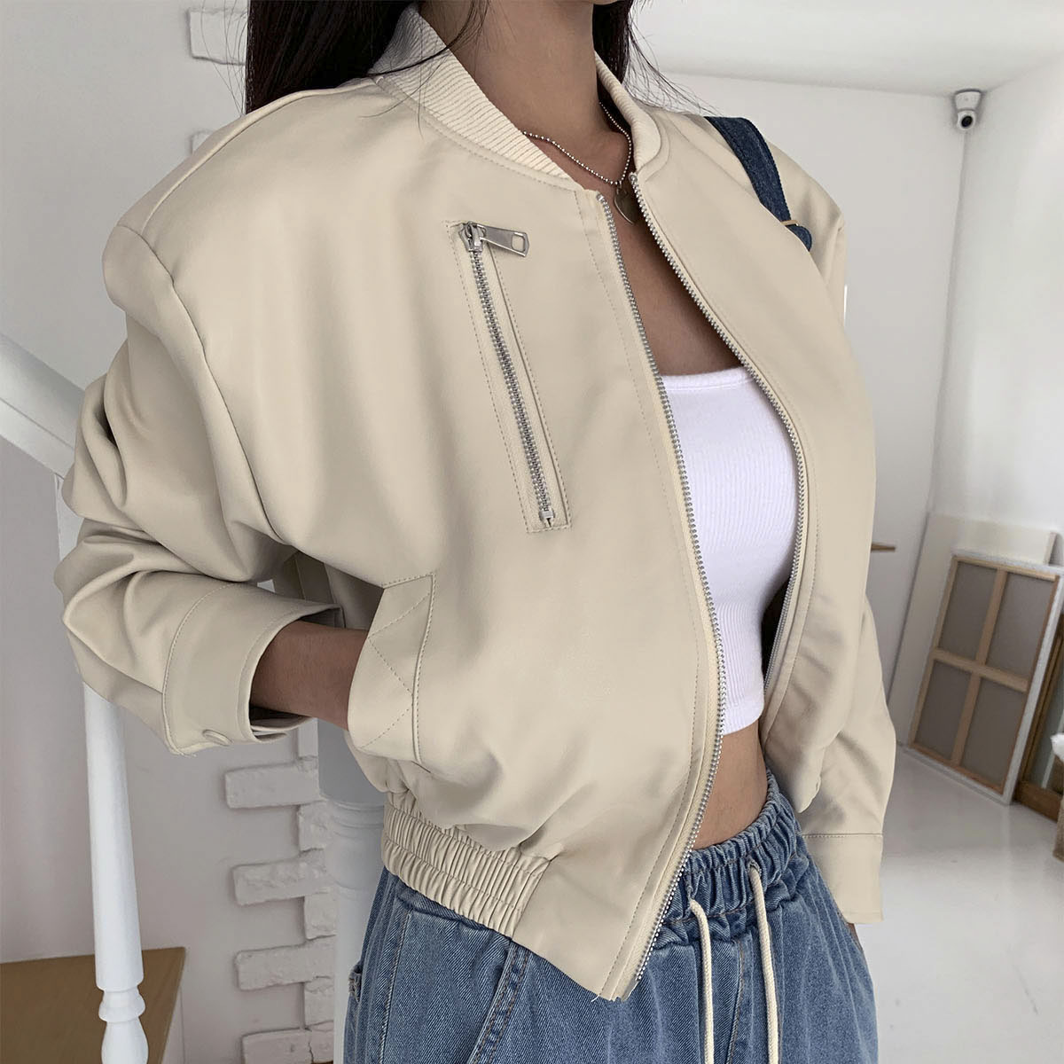 [가을자켓🍂fall 30%] 바시티 레더 블루종 보이핏 자켓 에코레더 가죽자켓