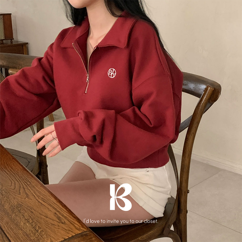 [MADE/탄탄!]라떼 카라 반집업 세미크롭 자수 맨투맨