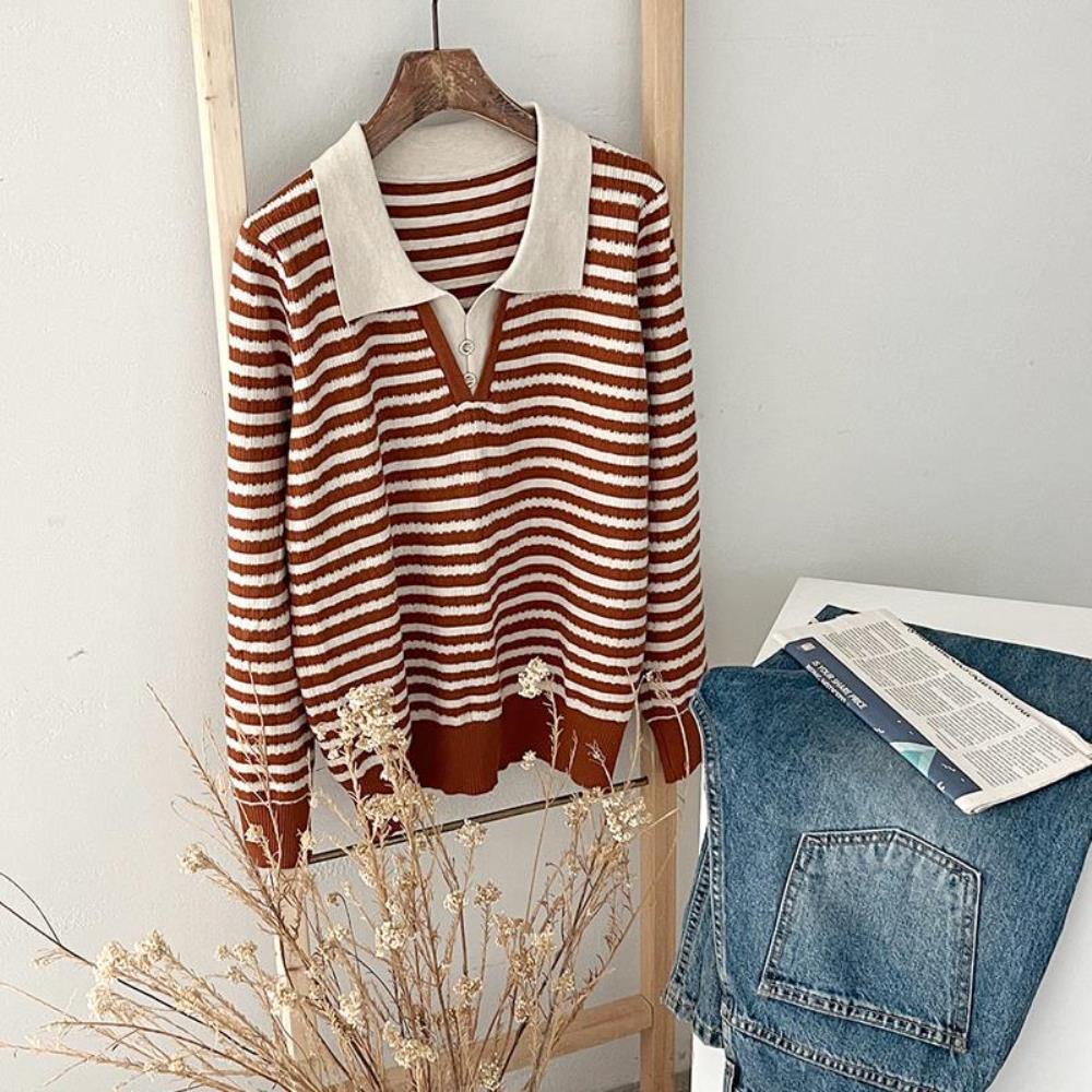 여자 이중카라 캠퍼스룩 단가라 가을긴팔 갈색 니트