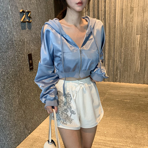 (고급광택)후드 새틴 실클 크롭 숏 집업 후드 아우터 티셔츠 강남룩 청담룩 올드머니룩