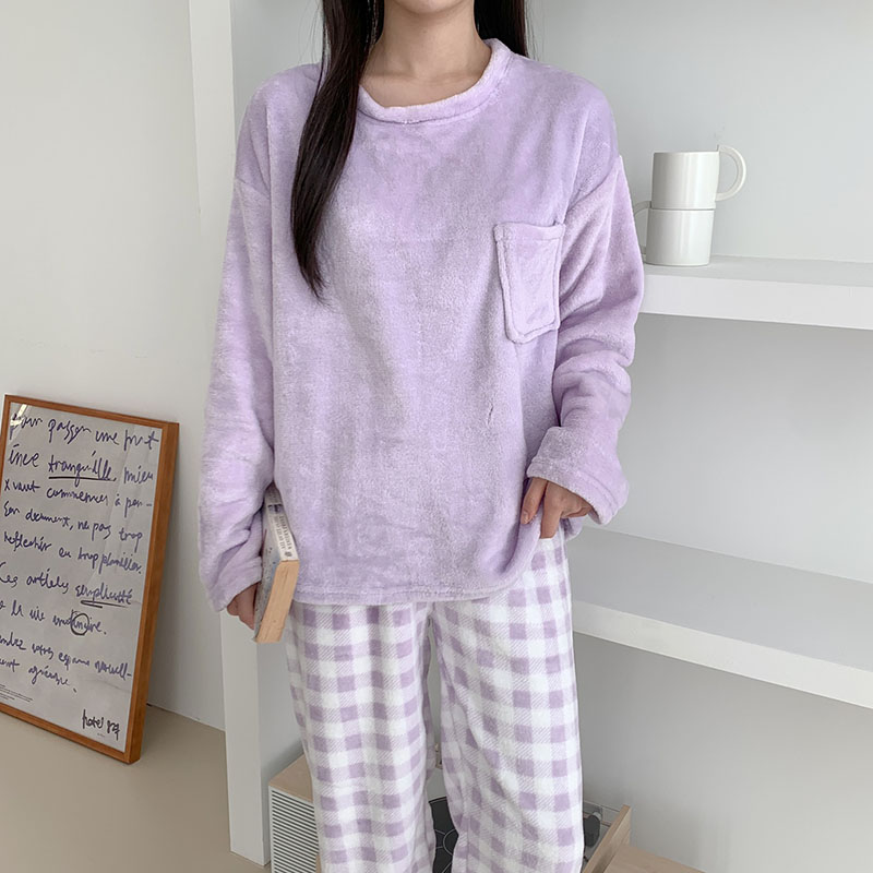 [당일출고🚀]라운드 포켓 극세사 체크바지 수면잠옷세트