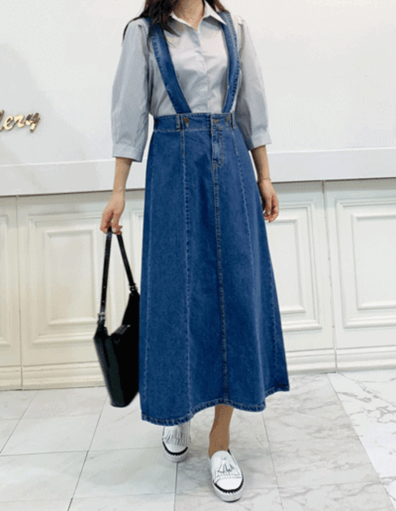 로일리 A라인 롱 멜빵 청치마