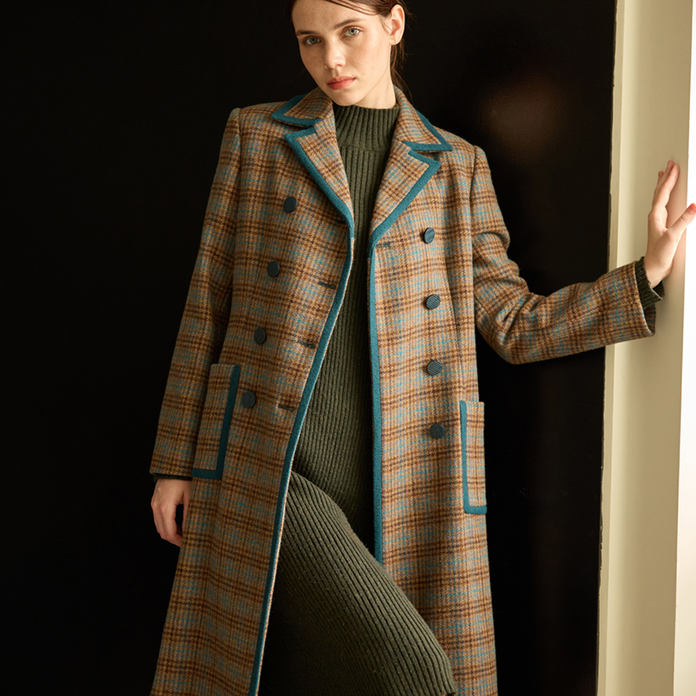 콤비 클래식컬 체크패턴 울 100% 더블브레스트 롱코트_BLUE-GREEN