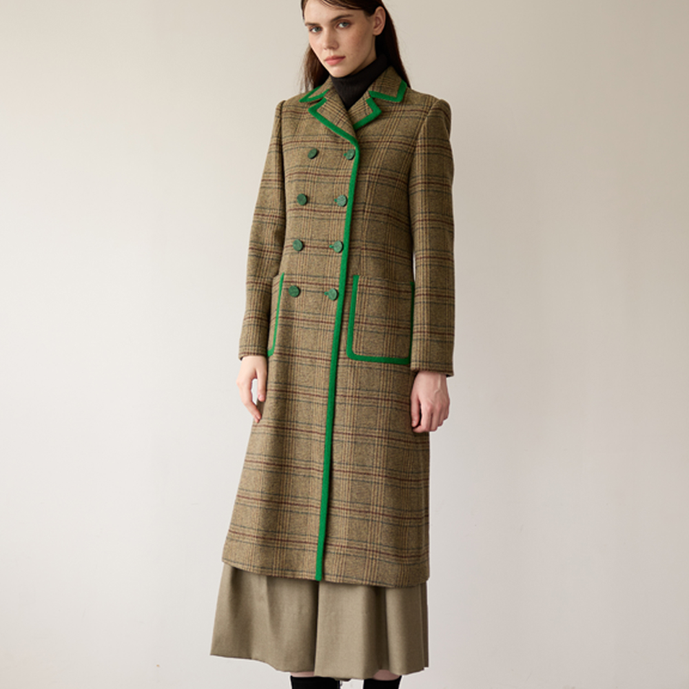 콤비 클래식컬 체크패턴 울 100% 더블브레스트 롱코트_VIVID-GREEN